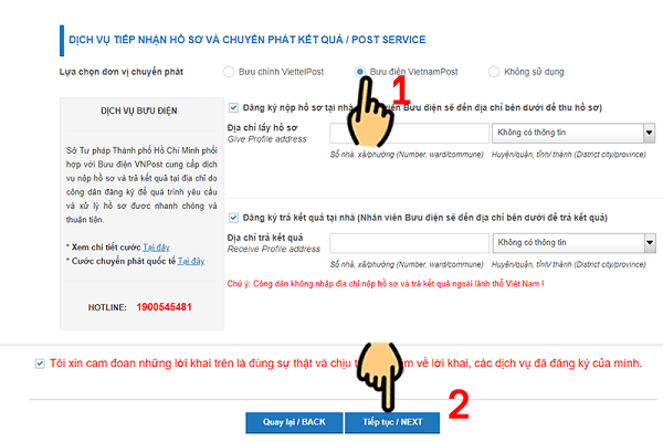 - Trường hợp, nhân viên chuyển phát không nhận hồ sơ và gửi kịp thời. Thì bạn sẽ phải khai báo lại trên trang.