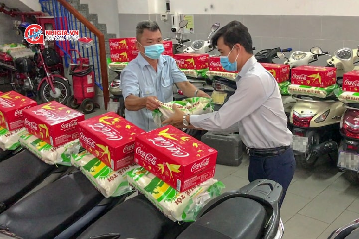 Từ khu vực để xe, hàng trăm suất quà (mỗi suất gồm 1 bao gạo 10kg và 1 thùng nước ngọt). Sẽ chẳng có gì đáng nói nếu như công ty còn cắt cử thêm một đội hỗ trợ đặt sẵn từng phần quà một cách cẩn thận, ngay ngắn sau yên xe của nhân viên và không quên chuẩn bị sẵn dây ràng.