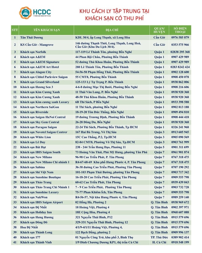 Trung tâm Kiểm soát bệnh tật TPHCM cho biết tính đến ngày 29/4, TPHCM có tất cả 41 khách sạn cách ly y tế tập trung có thu phí dành cho người Việt và người nước ngoài nhập cảnh về Việt Nam.