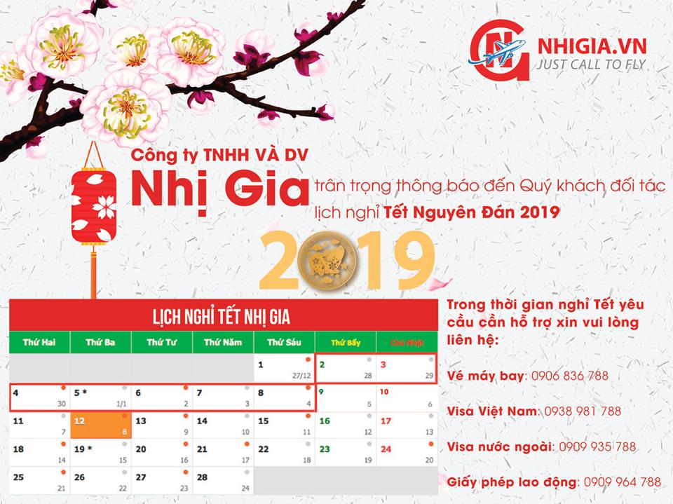 Công ty TNHH và Dịch vụ Nhị Gia trân trọng thông báo đến quý khách hàng, đối tác lịch Nghỉ tết Nguyên đán 2019 như sau: