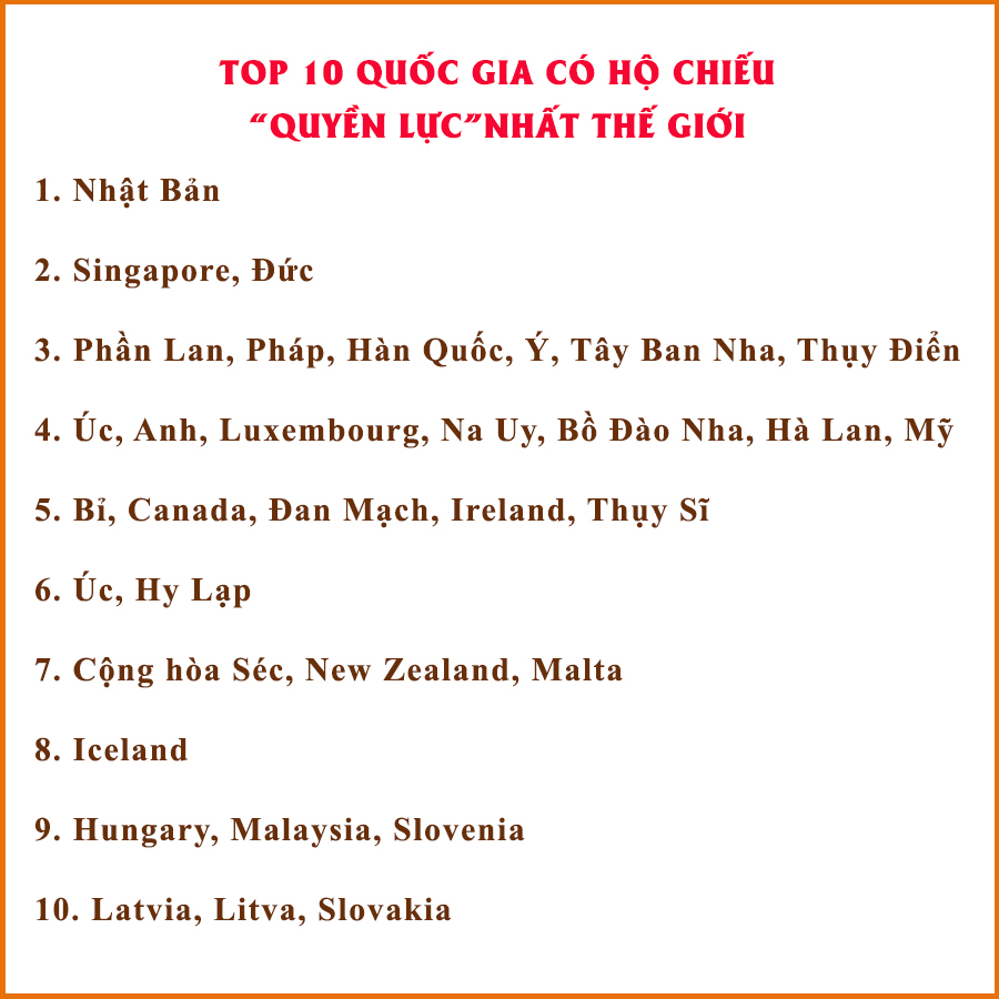 Xếp ở vị trí thứ 3 gồm hộ chiếu của các nước Hàn Quốc, Phần Lan, Pháp, Italy, Tây Ban Nha và Thụy Điển. Đồng hạng 4 là hộ chiếu Mỹ và Anh.